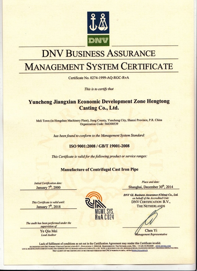 公司于2000年元月份通過了由挪威船級社主持審核的ISO9002質量體系認證,2011年又成功通過了轉標換版:ISO9001:2008。產品相繼通過了美國UPC、加拿大CSA、馬來西亞SIRIM產品認證。現有生產能力各類標準離心鑄鐵管三萬噸,產品質量高,企業(yè)信譽好,產品已出口美國、加拿大、德國、馬來西亞等國家和地區(qū),是曲沃縣的出口利稅大戶。